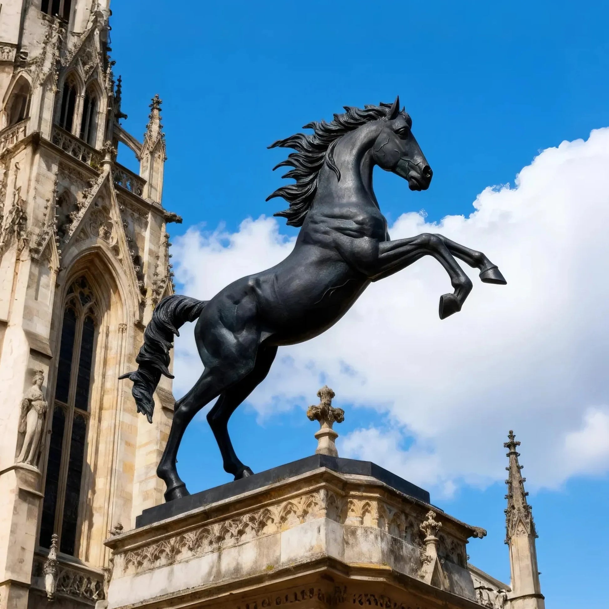 This outdoor metal sculpture captures the raw power and untamed spirit of a rearing stallion, its forelegs raised high and its expression filled with energy and defiance. Meticulously crafted with lifelike detail and a dynamic pose, it embodies strength, freedom, and timeless majesty.